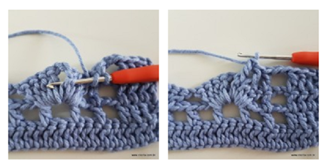 Observação: lembre-se que, se o seu ponto for muito apertado, pode fazer até 2 correntes de espaço entre um leque e outro para não ficar muito diferente da largura do início do trabalho.