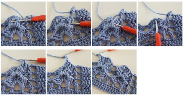 Assim, pule os 2 primeiros e faça 2 pontos altos em relevo. Em seguida, faça 2 pontos altos dentro do leque, 2 correntes e 2 pontos altos no mesmo lugar… Complete o leque fazendo 2 pontos altos em relevo. Faça até completar a carreira.