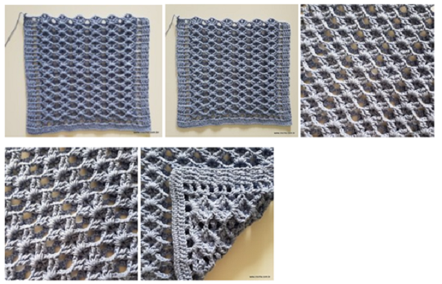 Observação: para fazer o ponto alto em relevo, você deve enrolar o fio na agulha, introduzir a agulha pegando o ponto de base como alça e fazer o ponto alto normal.