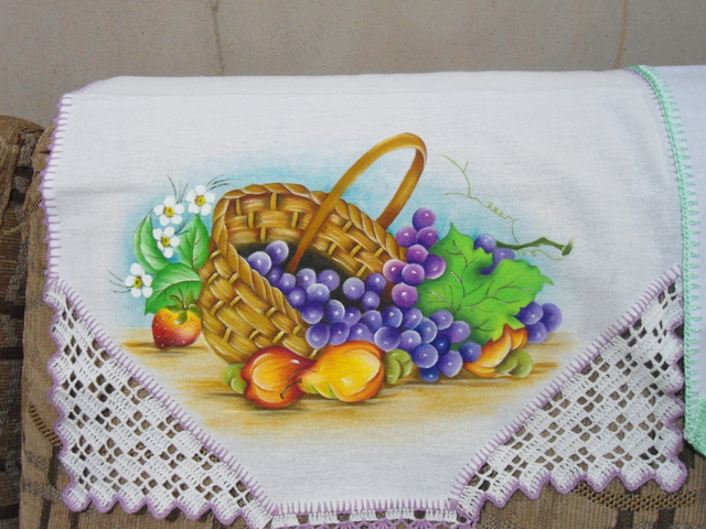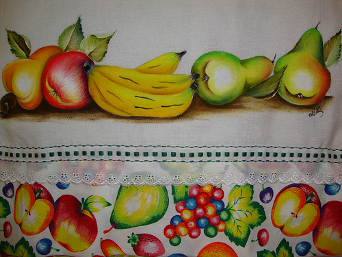 Para os panos de prato, as pinturas mais pedidas são as de flores e frutas, mas não podemos deixar de citar que também existem outros temas que fazem muito sucesso, como as vaquinhas, as joaninhas e as galinhas, que aparecem em várias versões.