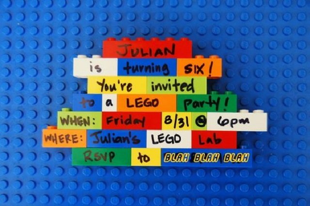 Para entrar no clima das brincadeiras de criança, uma possibilidade de convite é utilizando legos. Fica mais caro, mas vale super a pena!