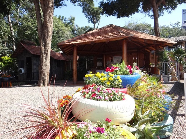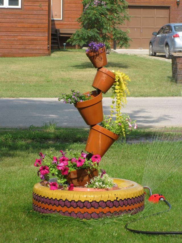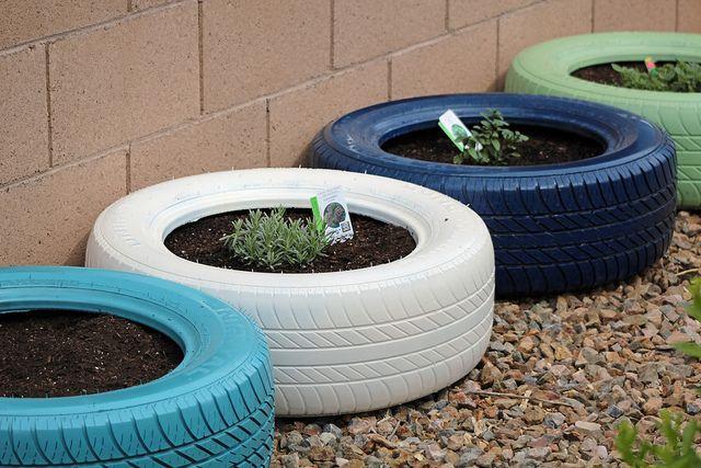 É possível fazer canteiros, com a sobreposição de um pneu sobre o outro, e também lindos vasos de plantas unitários.