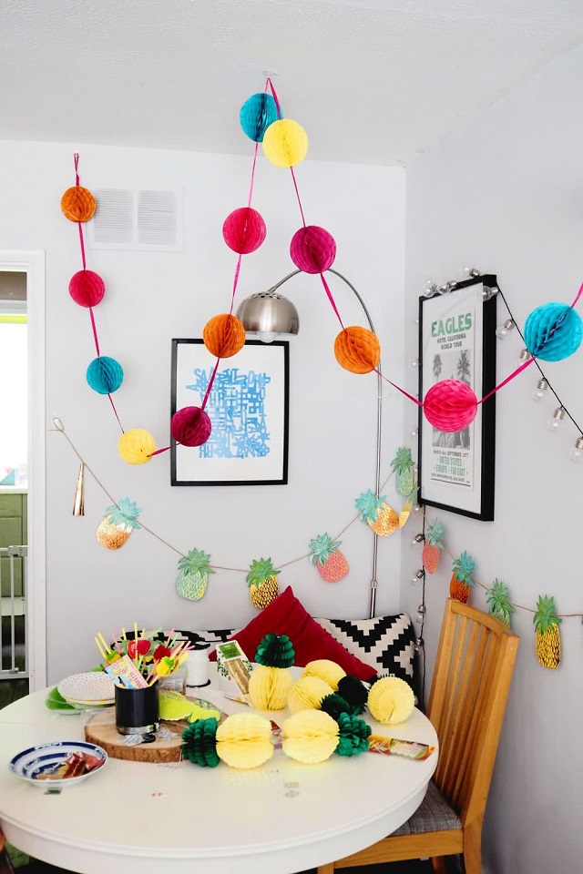 Nas paredes, use e abuse de fitas, balões, personagens em papelão, flores de papel, cataventos, pipas e todos os demais arranjos com a temática infantil que você tiver em casa. Tudo muito colorido!