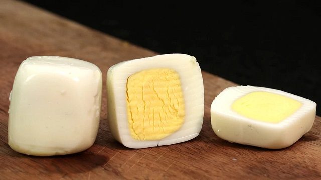 Aqui, será necessário colocar ovos cozidos e descascados em caixinhas de leite. Depois que esfriarem, eles sairão quadrados, em razão da albumina. Assim, eles se deformam com o aumento da temperatura. Um experimento bem legal, não é?