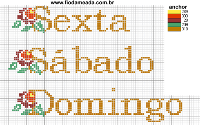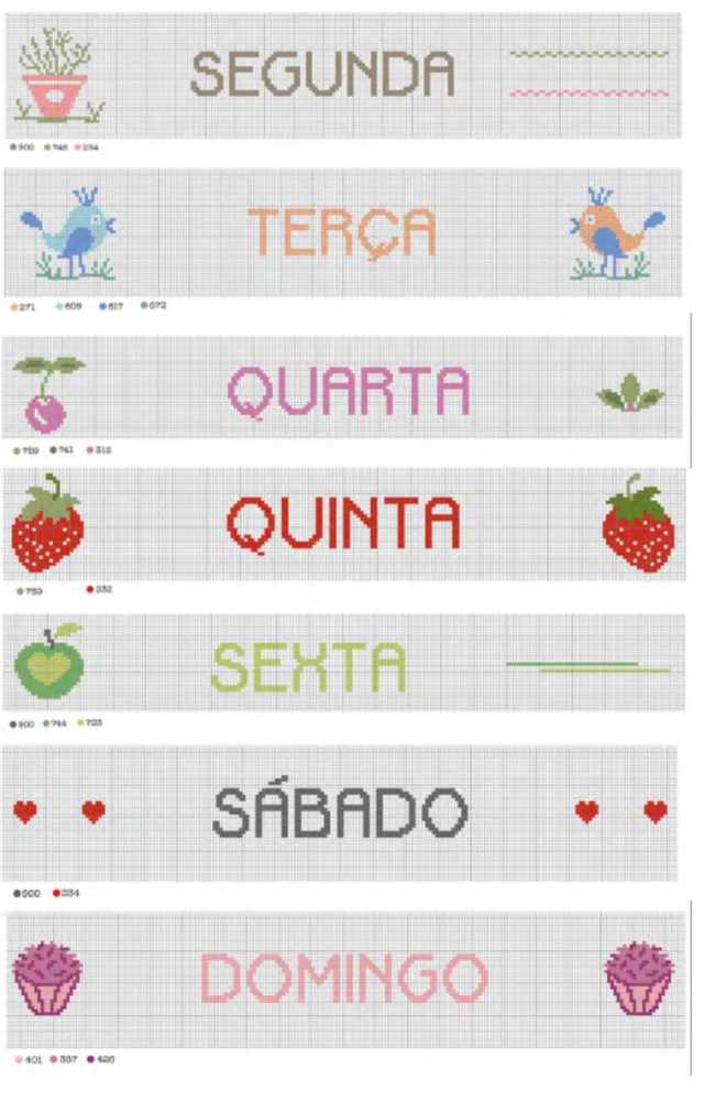 Por isso, aproveite esses gráficos para criar a sua própria semaninha em ponto cruz, seja variando as letras, os motivos ou até mesmo as cores.